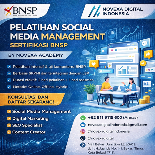 Banyak Brand Aktif Di Media Sosial, Tetapi Kontennya Tidak Konsisten Dan Sulit Diukur Dampaknya. Admin Hanya Fokus Pada Posting Rutin Tanpa Strategi Yang Jelas. Insight Tersedia, Namun Tidak Dianalisis Secara Sistematis. Akibatnya, Engagement Naik Turun Dan Tujuan Bisnis Tidak Tercapai. Melalui Pelatihan Social Media Management Sertifikasi BNSP, Novexa Academy Membantu Individu, UMKM, Dan Tim Perusahaan Membangun Sistem Pengelolaan Media Sosial Berbasis Standar Kompetensi Nasional. Program Ini Menggabungkan Pelatihan Intensif SKKNI Dan Uji Kompetensi BNSP Melalui LSP Mitra Resmi.